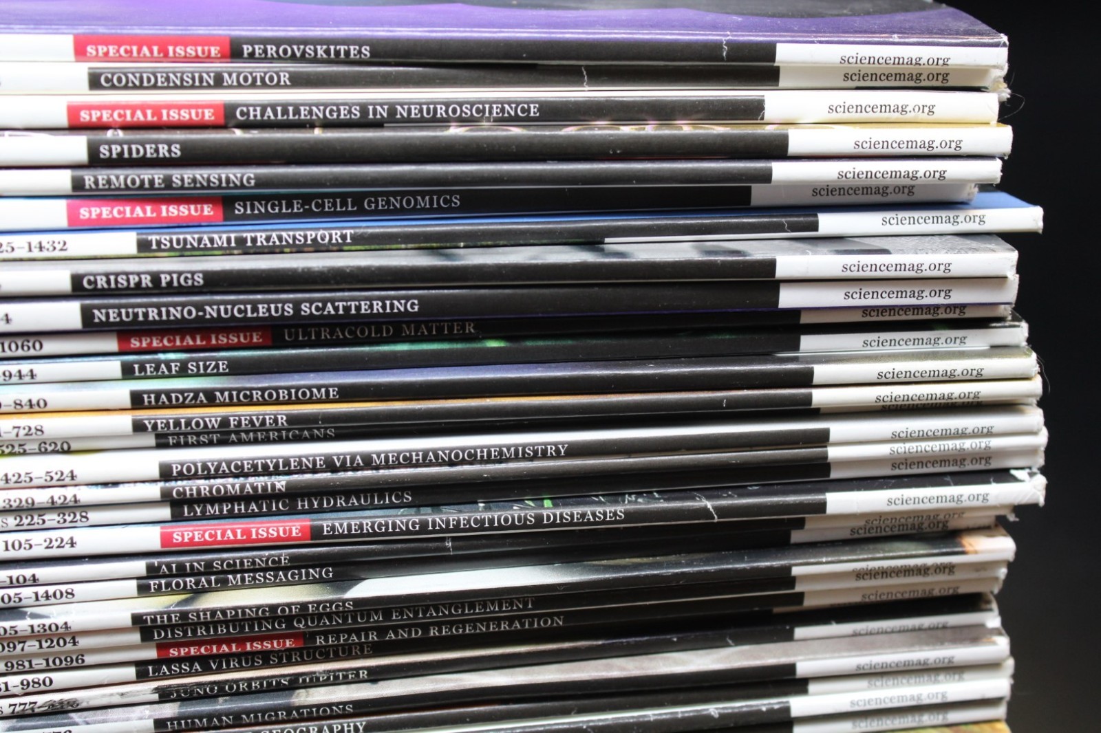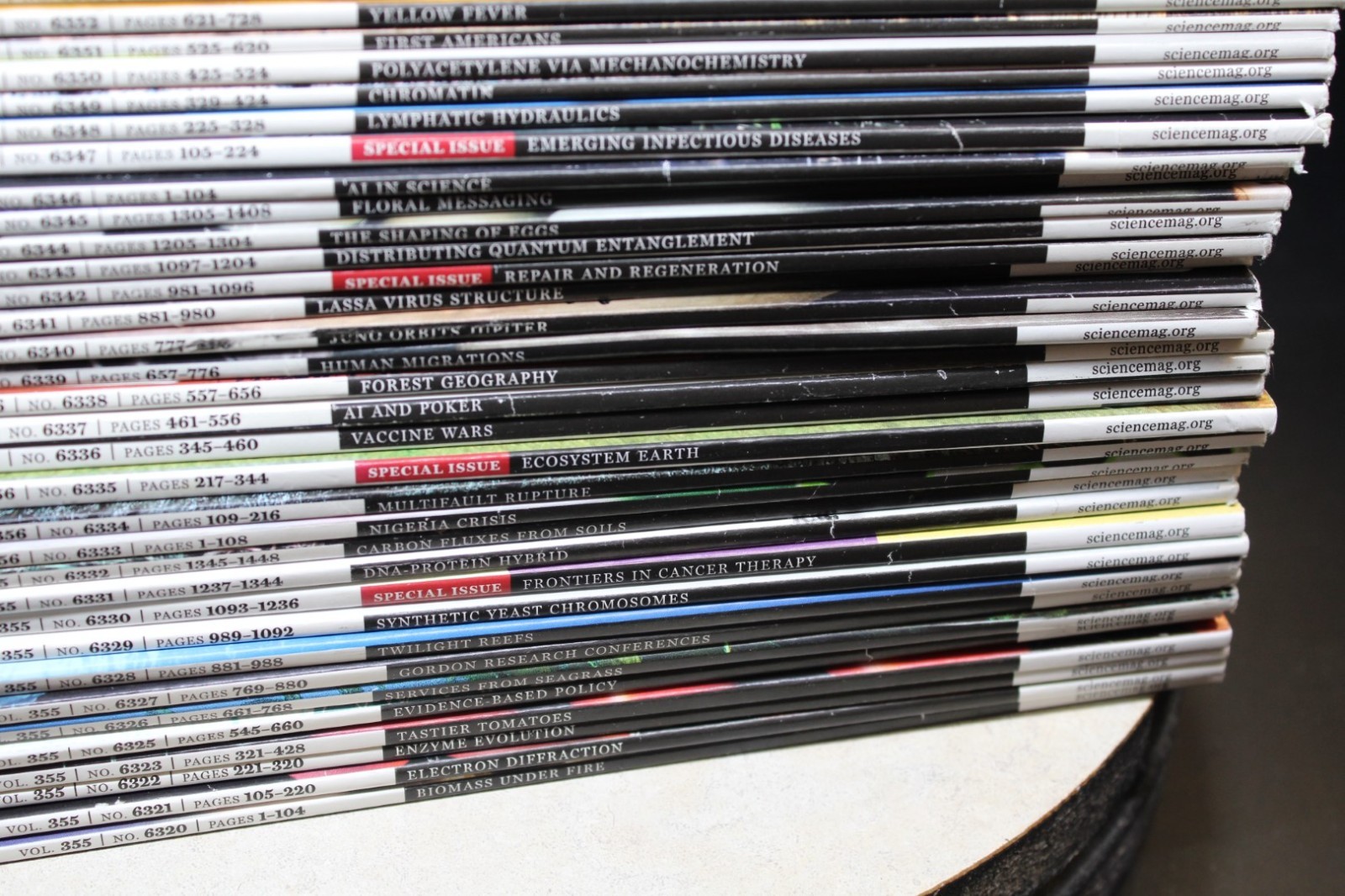 | Publication Year | Issue, Jan #6320 – Biomass Under Fire, Jan #6321 – Electron Diffraction, Jan #6322 – Enzyme Evolution, Jan #6323 – Tastier Tomatoes, Feb #6325 – Evidence Based Policy, Feb #6326 – Services From Seagrass, Feb #6327 – Gordon Research Conferences, Mar #6328 – Twilight Reefs, Mar #6329 – Synthetic Yeast Chromosomes, Mar #6330 – Frontiers in Cancer, Mar #6331 – DNA Protein Hybrid, Mar #6332 – Carbon Fluxes From Soil, Apr #6333 – Nigeria Crisis, Apr #6334 – Multifault Rupture, Apr #6335 – Ecosystem Earth, Apr #6336 – Vaccine Wars, May #6337 – AI and Poker, May #6338 – Forest Geography, May #6339 – Human Migrations, May #6340 – Juno Orbit Jupiter, Jun #6341 – Lassa Virus Structure, Jun #6342 – Repair and Regeneration, Jun #6343 – Distributing Quantum Entanglement, Jun #6344 – The Shaping of Eggs, Jun #6345 – Floral Messaging, Jul #6346 – AI in Science, Jul #6347 – Emerging Infectious Diseases, Jul #6348 – Lymphatic Hydraulics, Jul #6349 – Chromatin, Aug #6350 – Polycetylene via Mechanochemistry, Aug #6351 – First American, Aug #6352 – Yellow Fever, Aug #6353 – Hadza Microbiome, Sep #6354 – Leaf Size, Sep #6355 – Ultracold Matter, Sep #6356 – Neutrino-Nucleus Scattering, Sep #6357 – Crispr Pigs, Sep #6358 – Tsunami Transport, Oct #6359 – Single Cell Genomics, Oct #6360 – Remote Sensing, Oct #6361 – Spiders, Oct #6362 – Challenges in Neuroscience, Nov #6363 – Condensin Motor, Nov #6364 – Perovskites |